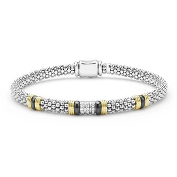LAGOS Black Caviar Two-Tone Ceramic Station Diamond Bracelet in Sterling Silver and 18K Yellow Gold, Size M
