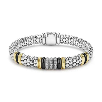 LAGOS Black Caviar Two-Tone Ceramic Station Diamond Bracelet in Sterling Silver and 18K Yellow Gold, Size M