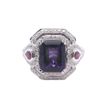 Charles Krypell Pastel Collection Amethyst Double Halo Ring with Rubies and Diamonds in 18K White Gold