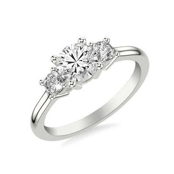 Three Stone Engagement Ring with Round Side Stones and Polished Shank Complete with Center Stone Metal - 14K white gold Center Diamond - Round brilliant cut, approximately .70 carat, SI2 clarity, J color Accent Diamonds - 2 Round full cut, approximately 0.35 carat total weight, SI1 clarity, F-G color Setting - Prong set