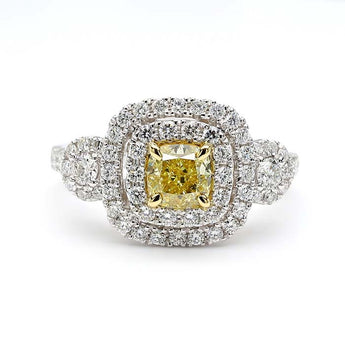 Mountz Collection Fancy Yellow Cushion Diamond Halo Ring in Platinum and 18K Yellow Gold