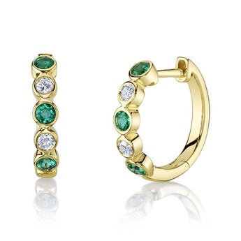 Shy Creation Alternating Emerald and Diamond Bezel Set Huggie Earrings in 14K Yellow Gold