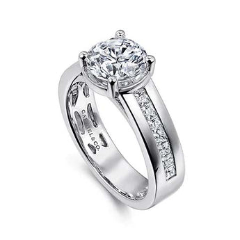 In this contemporary engagement ring your round diamond is secured by four prongs. A wide band of polished 14K white gold, accented by a channel of princess cut diamonds, provides a dramatic appearance and substantial feel.