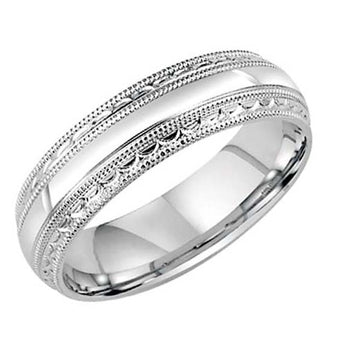 Goldman Men's 6MM Wedding Band Polished Center, Milgrain Edge and Engraved Scallop Design in 14K White Gold