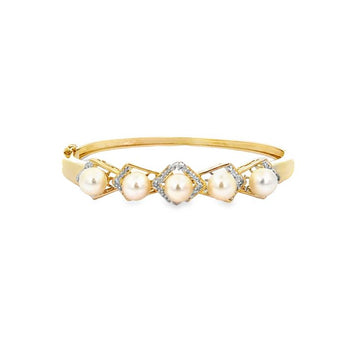 Estate Pearl and Diamond Oval Bangle Bracelet in 14K Yellow Gold