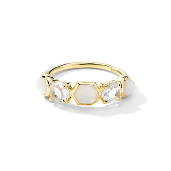 The pale tones of white moonstone, rock crystal and mother-of-pearl converge on this 18K gold ring. It’s comprised of multi-shape bezels and prong settings, arranged into a linear row to create a striking accessory. Wear it solo or stacked to punctuate any look with soft color and luminous shine.