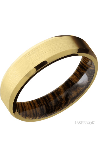 6 mm wide Beveled 18K Yellow Gold band featuring a Bocote sleeve.