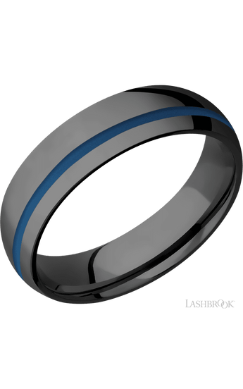 6 mm wide/Domed/Zirconium band with one 1 mm Off Center inlay of Ridgeway Blue.