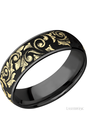 7 mm wide/Domed/Zirconium band with one 6 mm Centered inlay of 14K Yellow Gold with a laser carved Western Scroll pattern.