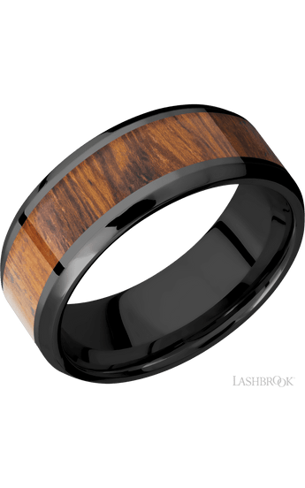 8 mm wide/Beveled/Zirconium band with one 5 mm Centered inlay of Desert Iron Wood.