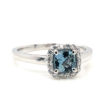 Mountz Collection Cushion Shaped Aquamarine and Diamond Halo Ring in 14K White Gold