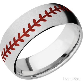 Lashbrook Mens 8mm Cobalt Wedding Band with Red Enamel Baseball Stitch Pattern