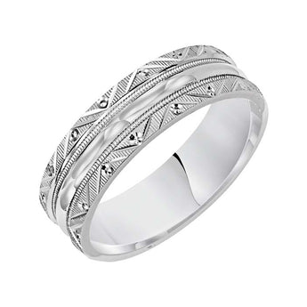 Goldman Men's 6MM Wedding Band with Polished Edge, Milgrain and Line Pattern 14K White Gold