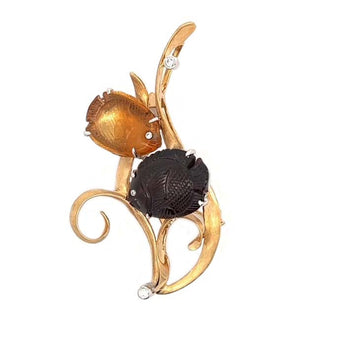 Estate Carved Amethyst and Citrine Fish Brooch in 18K Yellow Gold