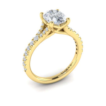 Radiating elegance and romance, this stunning split shank oval engagement ring features a split shank pave diamond band in an elegant cathedral setting. The diamond band rises like two arms holding the center stone, a beautiful celebration of love's timeless embrace.