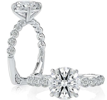 The Unique Round Center Engagement Ring features a brilliant round-cut center stone, set to maximize its fire and brilliance. The band is adorned with a halfway single shared prong diamond setting, creating a seamless row of sparkle along the A.JAFFE Sign.