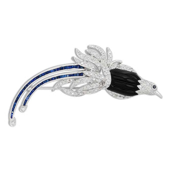 Estate Diamond, Sapphire, and Onyx Bird Pin in 18K White Gold