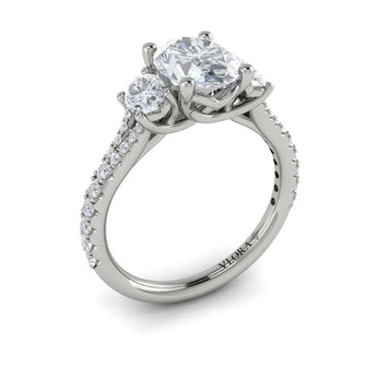 The strands of time weave your lives together with love. In this romantic three stone engagement ring, a graceful oval center diamond is flanked by two matching oval side stones to symbolize the past, present, and future of your love story. A diamond pave split shank reaches for the center diamonds like a loving embrace. A gracefully interwoven setting embraces and elevates the diamonds, reflecting the intertwined journey of your lives. With every intricate and meaningful detail, this stunning three stone engagement ring celebrates your unique journey together.