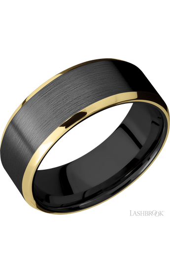 8 mm wide/Beveled/Zirconium band with two 1 mm Edge inlays of 14K Yellow Gold.