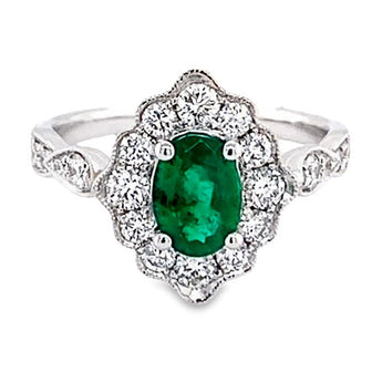 Mountz Collection Emerald and Diamond Halo Ring in 18K White Gold