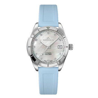 NORQAIN 37mm Adventure Sport Automatic Watch with Mother-Of-Pearl Diamond Dial in Stainless Steel and Light Blue Rubber Strap