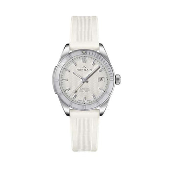 This 37mm automatic-winding Adventure Sport timepiece features the distinctive “NORQAIN pattern” on its white dial. There is a date window at 3 o’clock and Superluminova covers the hands so you can read the time no matter where your adventures take you. The stainless steel watch has a knurled bezel complete with a sporty ceramic ring. This NORQAIN Adventure Sport Lady is fitted with a steel bracelet. Powering this robust wristwatch is the NORQAIN caliber NN09, which is visible through the sapphire glass caseback.
