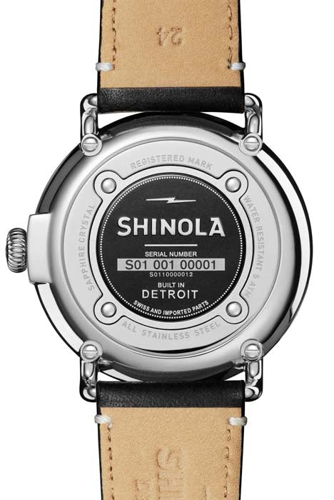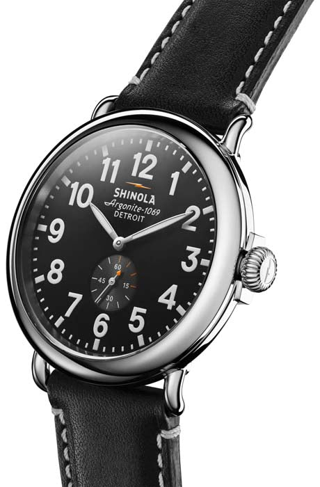 Shinola 47MM Runwell Watch in Polished Stainless Steel with Black Dial and Black Leather Strap
