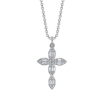 Shy Creation Baguette Diamond Cross Pendant Necklace in 14K White Gold